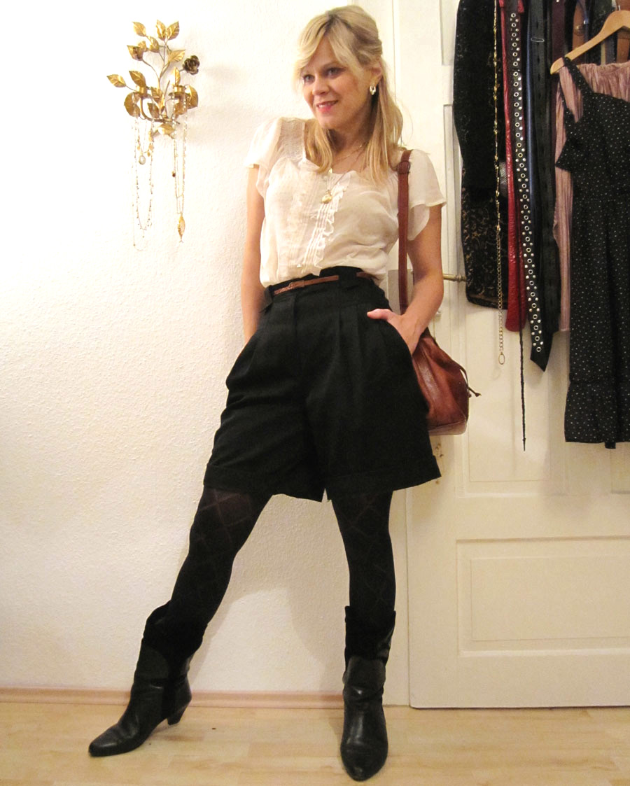 I hate using flashlight ... top: no name // scarf: flea market // skirt: vintage ebay // belt: thrifted // tights with dots: h&m // opaque tights: can't remeber (i changed them because i had to notice when i checked the fotos that the black of the skirt wasn't working with the black of those tights ...) // booties: h&m // balck bag: abro // vintage weekender: flea market // earrings and bracelet: from several flea markets
